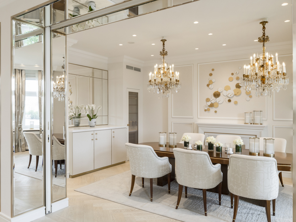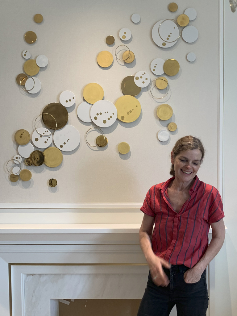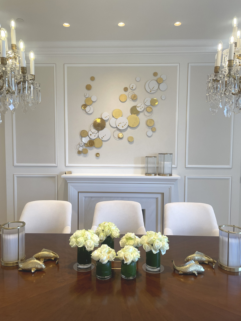 HEAVEN’S GATE, a wall object created from porcelain circles in both high-gloss and matte finishes, accented with real gold and paired with brass rings, was developed around the theme of the four elements. We designed the piece as a fireplace artwork for the Presidential Suite of the Fairmont Hotel Four Seasons Hamburg.