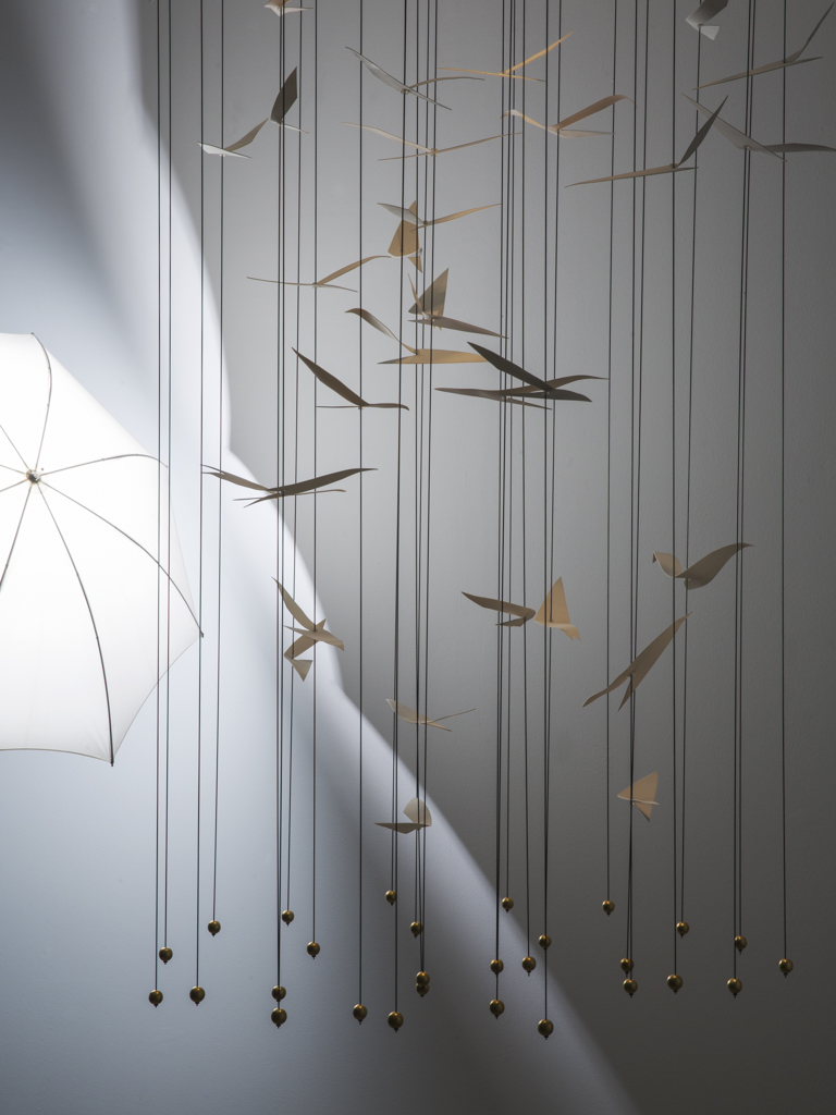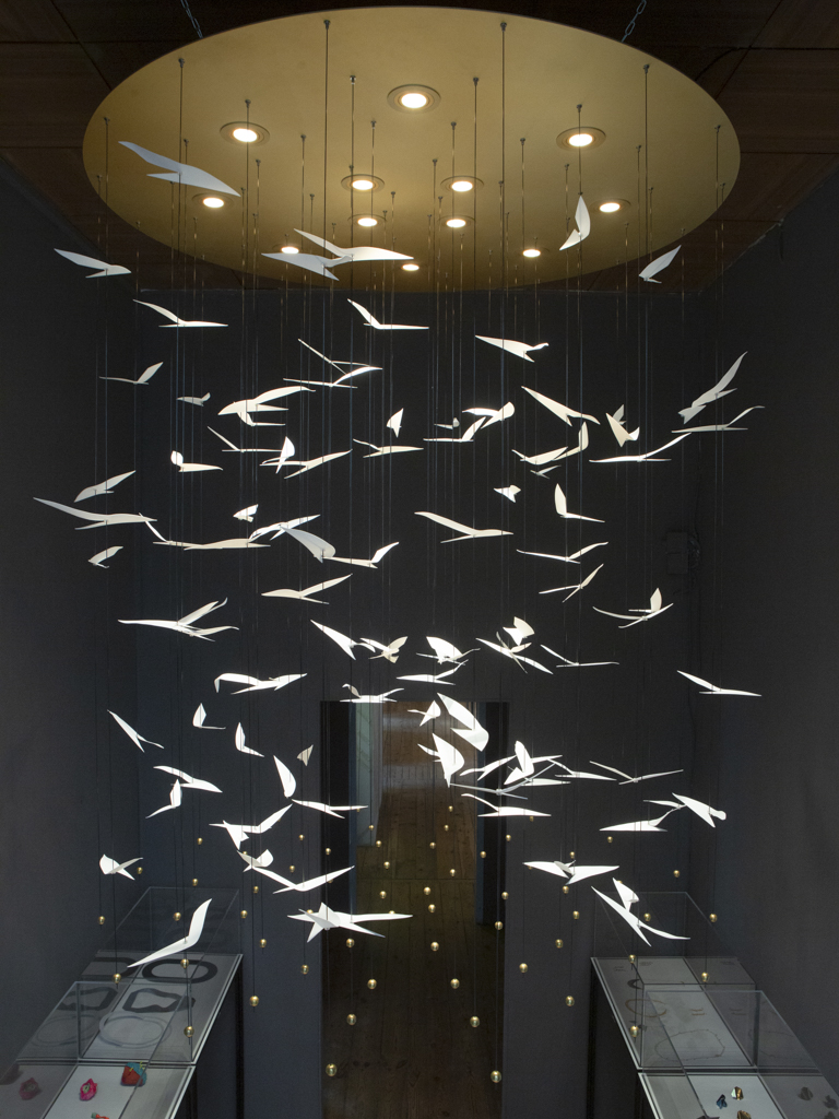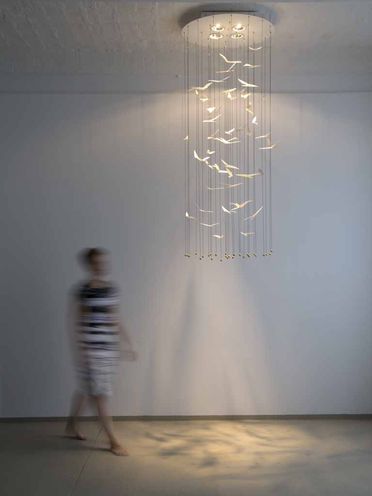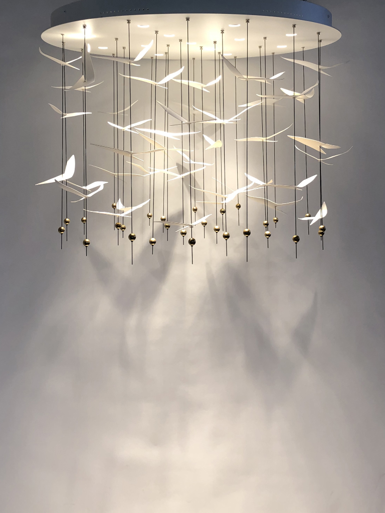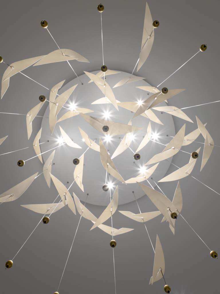 The piece is composed of delicate biscuit porcelain ‘birds’ suspended from sleek black carbon rods, with small porcelain spheres hand-painted in real gold.