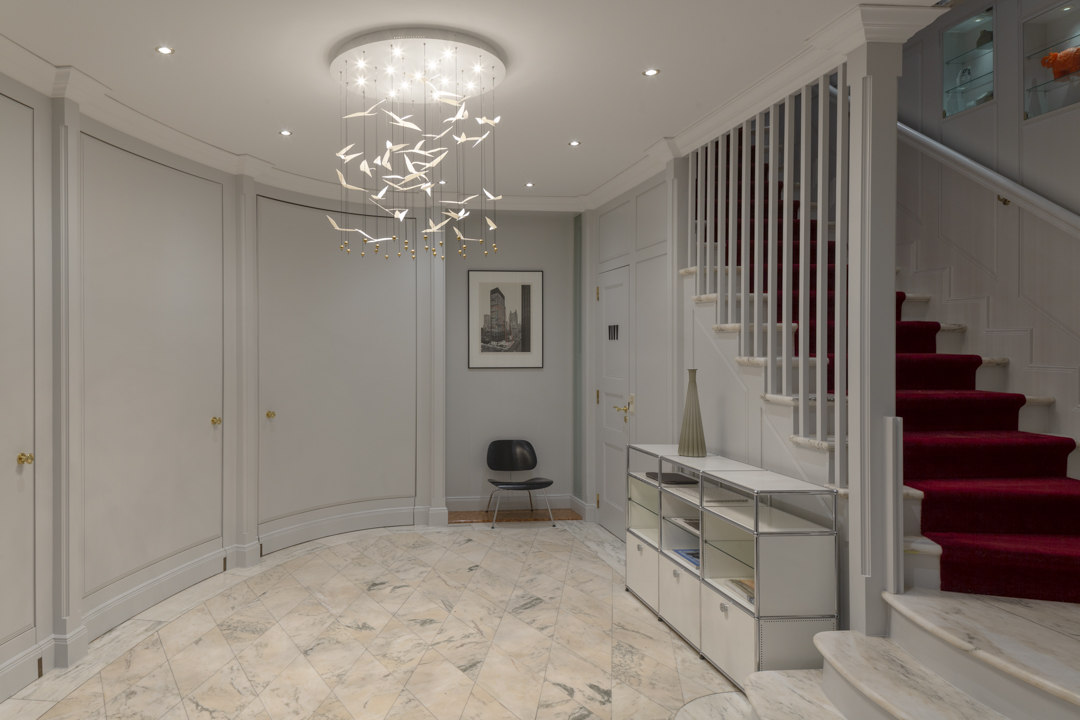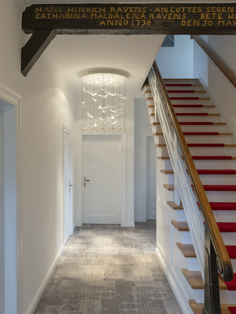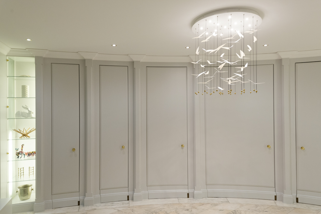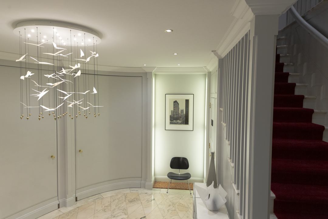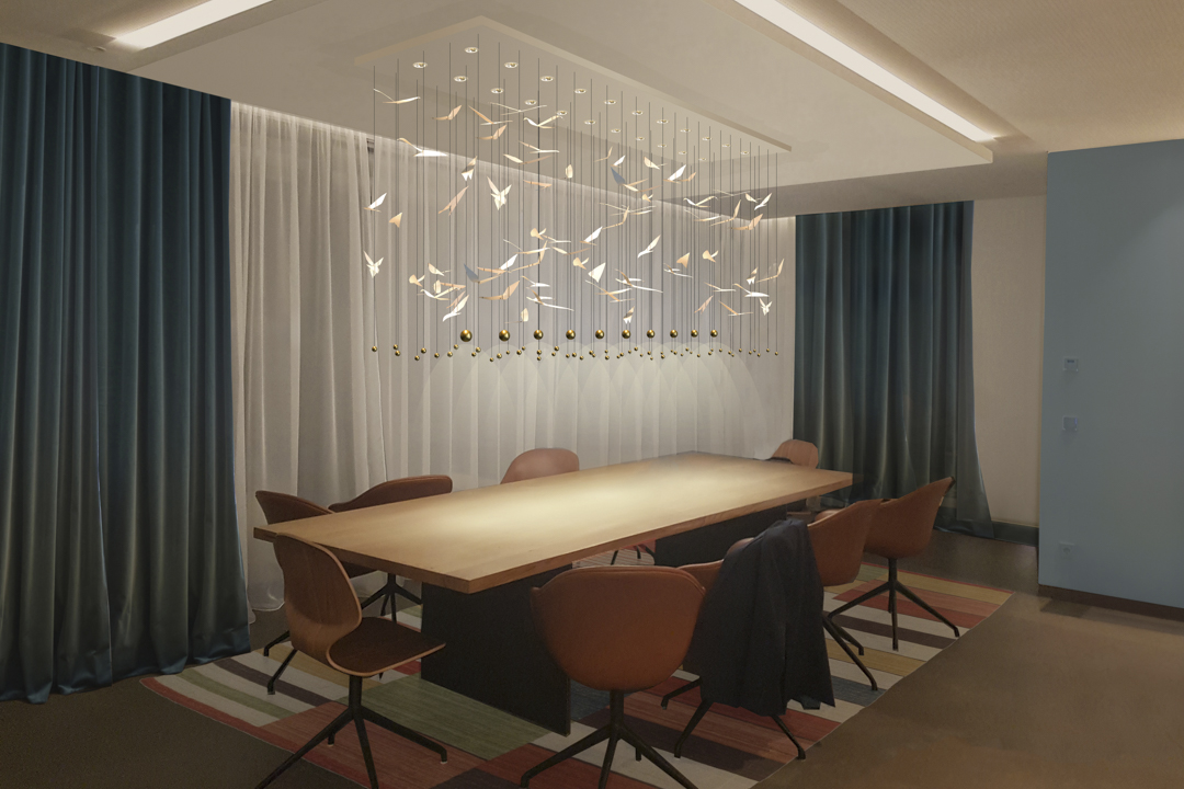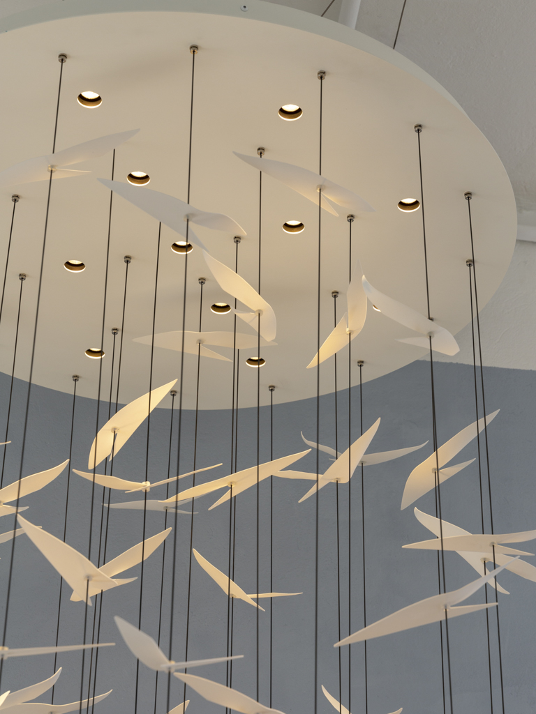 The piece is composed of delicate biscuit porcelain ‘birds’ suspended from sleek black carbon rods, with small porcelain spheres hand-painted in real gold.