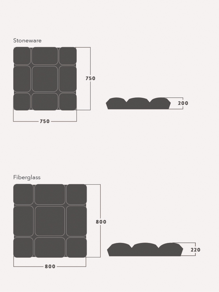 coated PU-foam | size [fiberglass] 88 x 88 x 24 cm, [ceramic] 75 x 75 x 20 cm