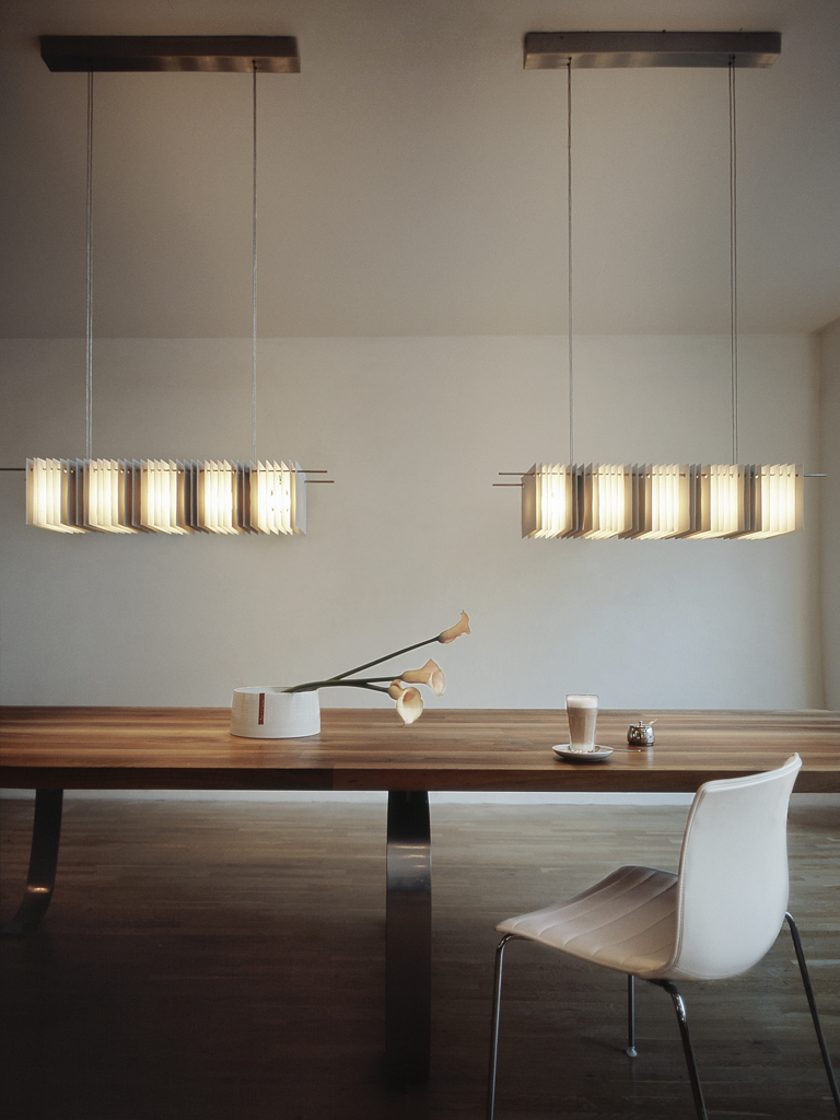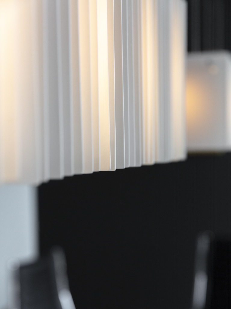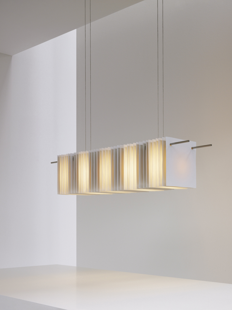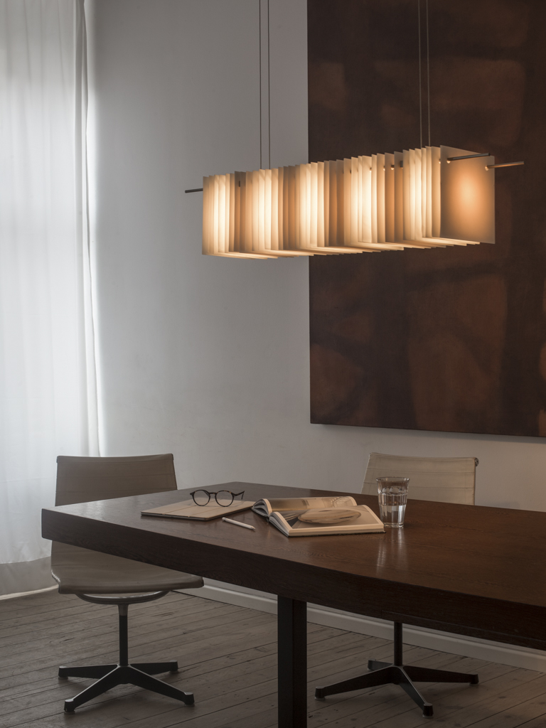 The pendant THINCUT consists of forty thin, hand-moulded porcelain panels that float still in the air like untouched folios. Light falls rhythmically through the lamellar gaps, gently colouring the translucent porcelain sheets in repeating shades. When unlit, the porcelain is snow-white again. The standard length of the luminaire is 100 cm, other lengths and sizes are available on request.