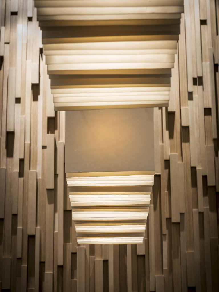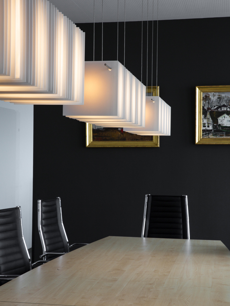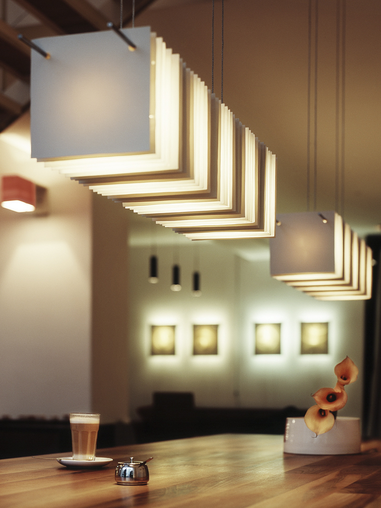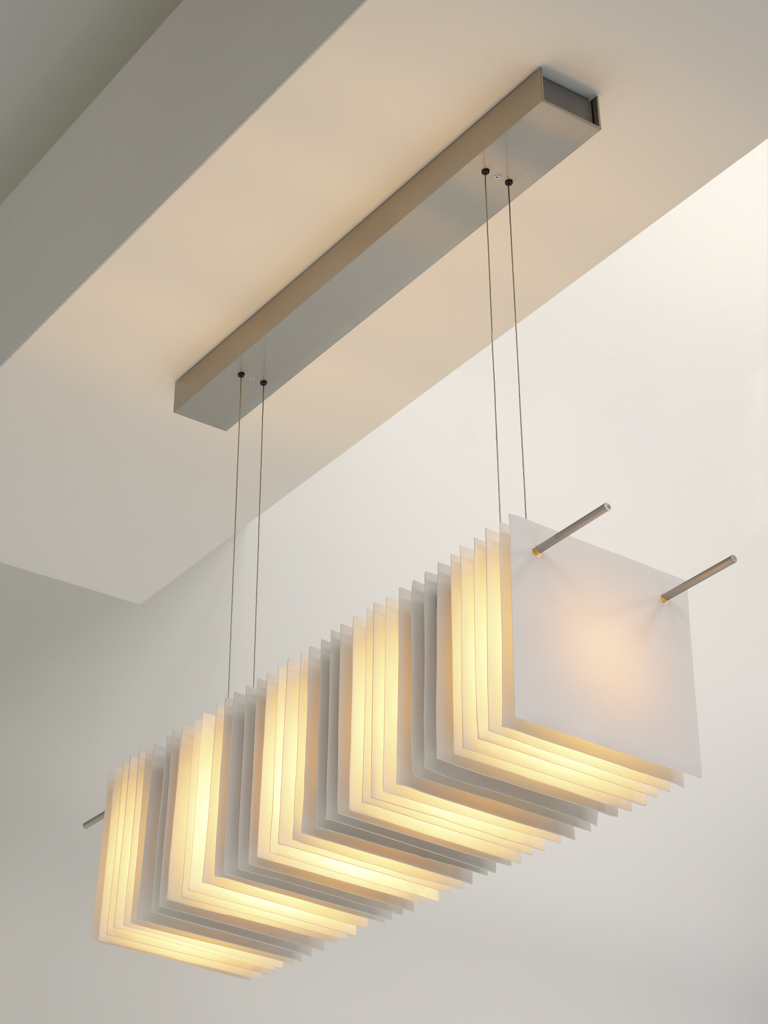 The pendant THINCUT consists of forty thin, hand-moulded porcelain panels that float still in the air like untouched folios. Light falls rhythmically through the lamellar gaps, gently colouring the translucent porcelain sheets in repeating shades. When unlit, the porcelain is snow-white again. The standard length of the luminaire is 100 cm, other lengths and sizes are available on request.